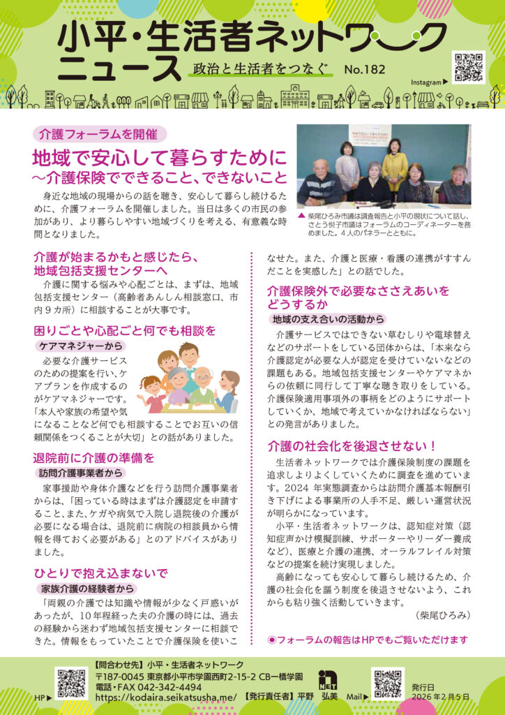 2026年2月11日 / 最終更新日 : 2026年2月11日 kodaira トピックス 小平・生活者ネットワークニュースNo.182発行 小平・生活者ネットワークニュースNo.182発行しました。 FacebookXBlueskyHatenaCopy